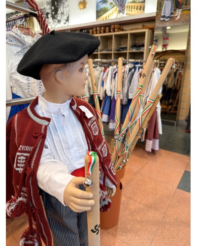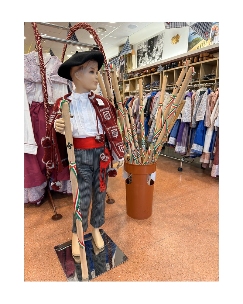 Es un accesorio imprescindible en actos escolares, coros infantiles y fiestas populares, formando parte de los trajes vascos infantiles. Fabricada en madera y decorada con cintas de colores vascos, aporta autenticidad y tradición al conjunto.