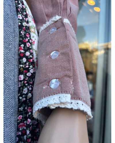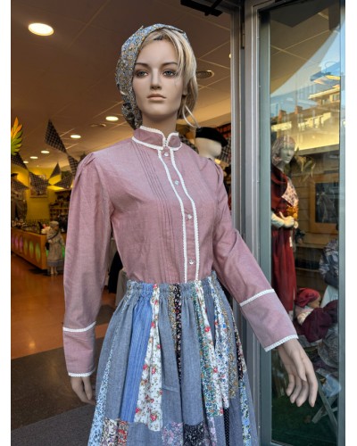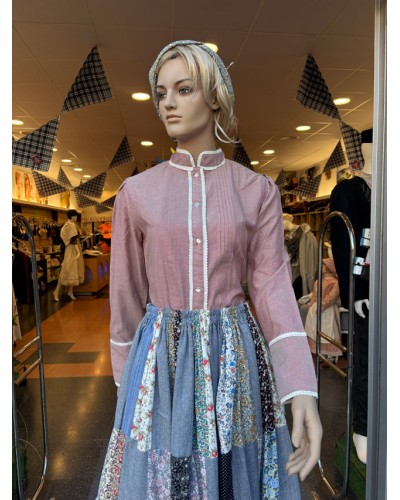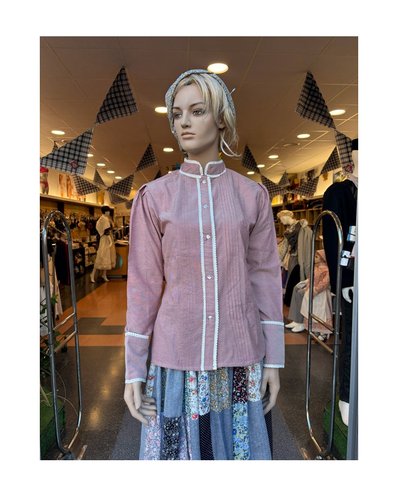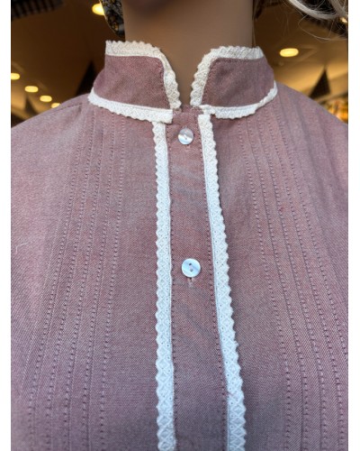 Blusa tradicional vasca para mujer confeccionada en tono granate suave, rematada con finas puntillas blancas que recorren el cuello, el cierre central y los puños. Su estructura con pliegues delanteros aporta verticalidad y un acabado limpio, muy característico de las blusas aldeanas clásicas.