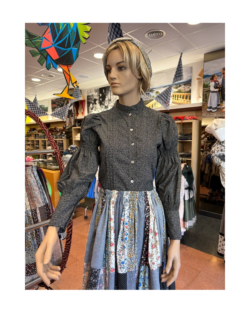 Esta blusa negra de flores destaca por su presencia seria y a la vez delicada. El estampado pequeño crea textura sin recargar, y la forma de la manga —con volumen en el hombro y ajuste en el antebrazo— le da una silueta muy reconocible dentro del vestuario tradicional vasco.