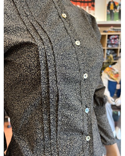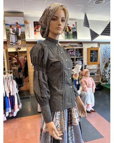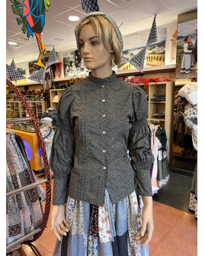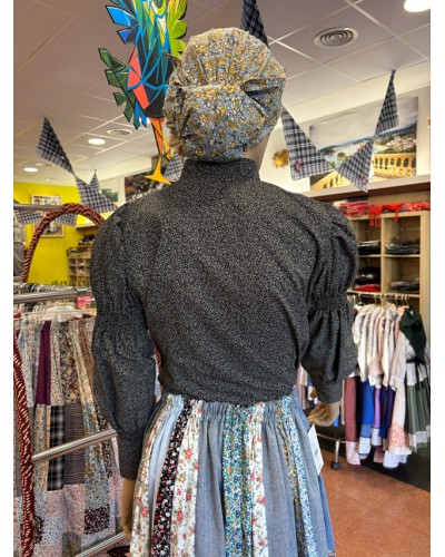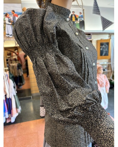 Blusa aldeana de corte entallado confeccionada en un tejido negro con estampado floral micro. El patrón incorpora frunces en la parte superior de la manga, lo que aporta volumen y una forma muy característica de las blusas tradicionales más antiguas.