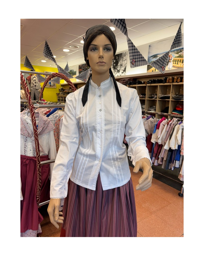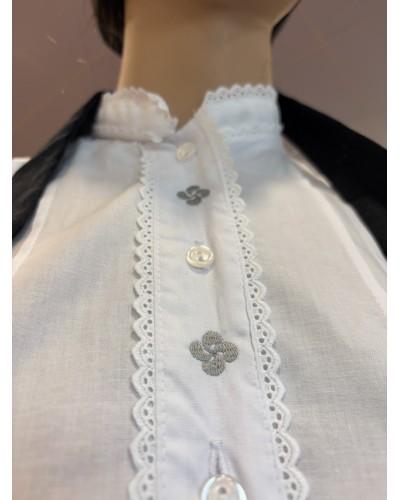 Blusa tradicional vasca blanca con bordado de laburus grises en la parte frontal, inspirada en los diseños clásicos del traje regional femenino.