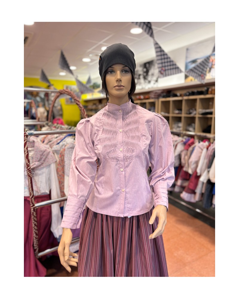 Esta blusa vasca rosa destaca por su diseño tradicional y sobrio, con lorzas cuidadosamente trabajadas en la pechera, un detalle característico de la indumentaria vasca femenina.