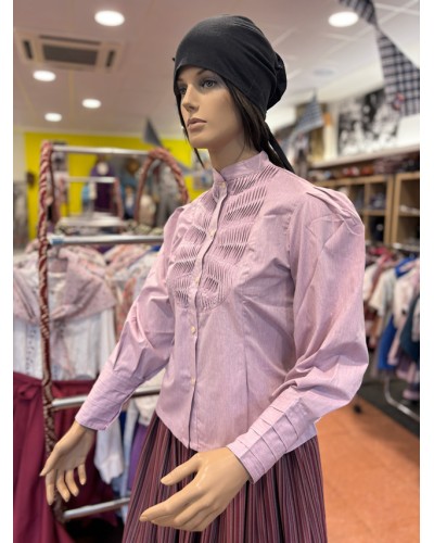 Blusa vasca rosa de estilo tradicional con lorzas decorativas en la pechera. Un diseño clásico y elegante, ideal para completar trajes vascos y conjuntos de casera.