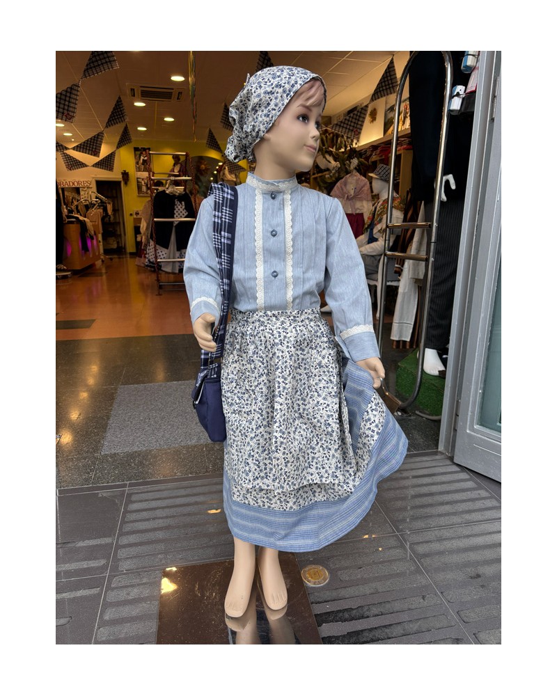 Blusa urdinez, gonaz, mantal estanpatuz eta musuzapiz osatutako haur talde euskalduna. Euskal jantzi herrikoien tradizioan oinarritutako diseinua.