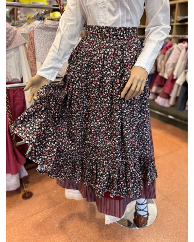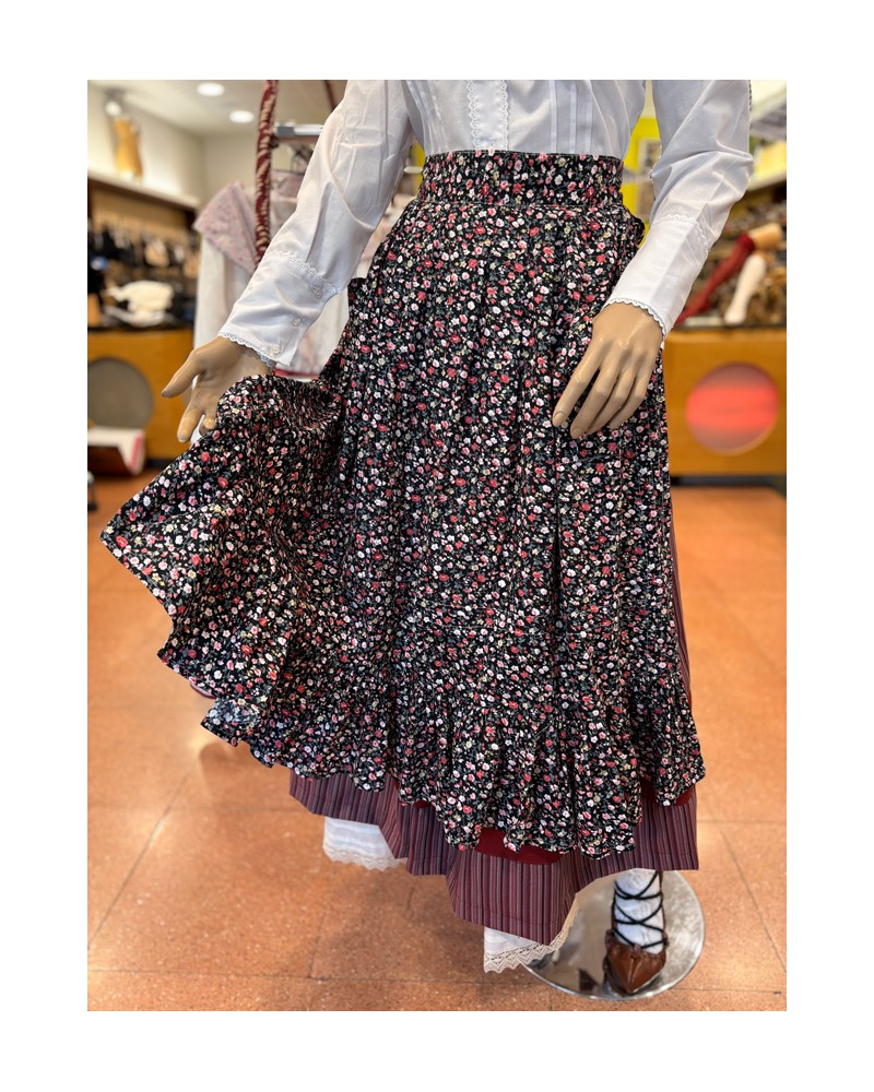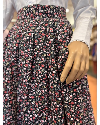 Lore estanpatua duen kolore beltzeko emakume-amantal hau oso pieza bereizgarria da emakumezkoen jantzi tradizionalaren barruan. Lore txikien diseinuak kolorea eta mugimendua ematen ditu, aldi berean euskal jantzien esentzia klasikoa mantenduz.