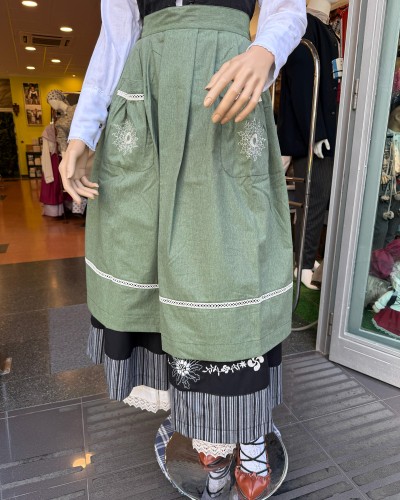 Euskal arropaz egindako mantala, tonu berdean, eguzkilore brodatuarekin eta puntillazko akaberekin. Diseinu dotore eta naturala zure euskal jantzia osatzeko.