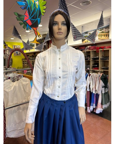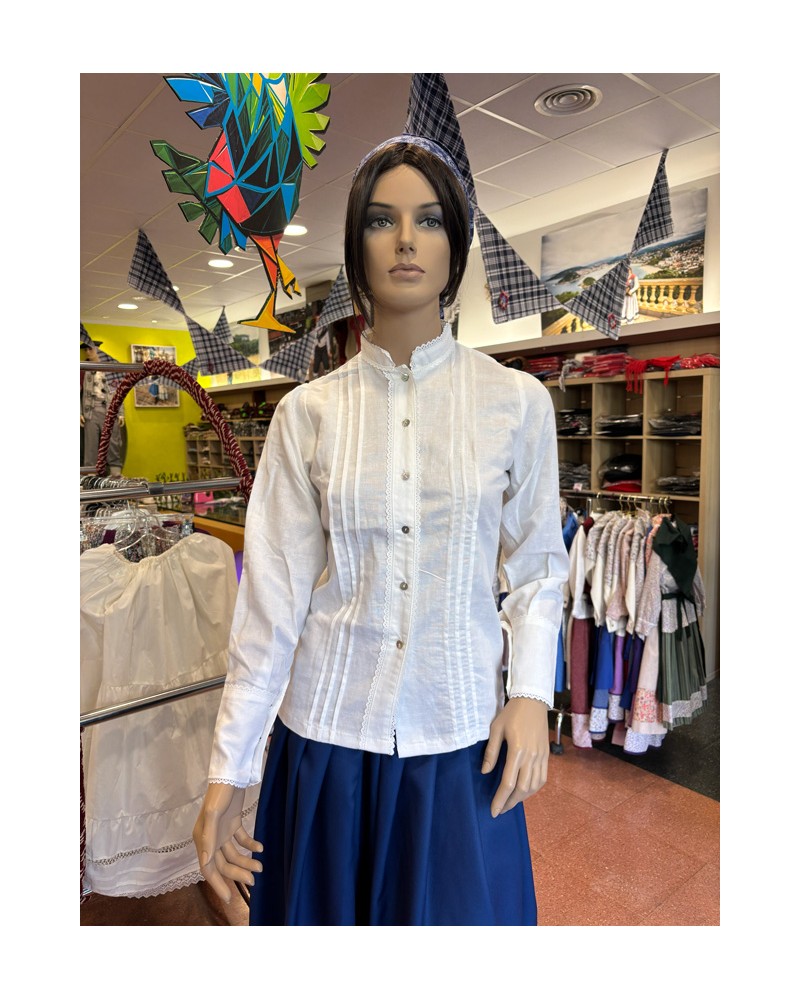 Baserritarren blusa zuria, lortza eta botoi metalikoekin. Euskal janzkera tradizionalaren ezinbesteko oinarria, gonekin, mantalekin eta zapiekin konbinatzeko ezin hobea.
