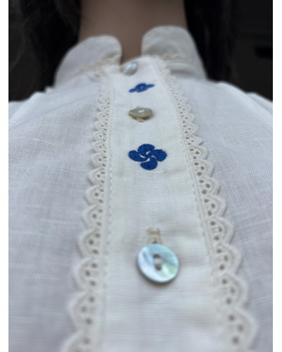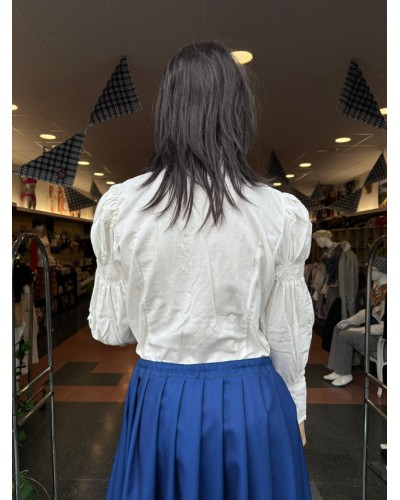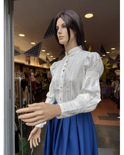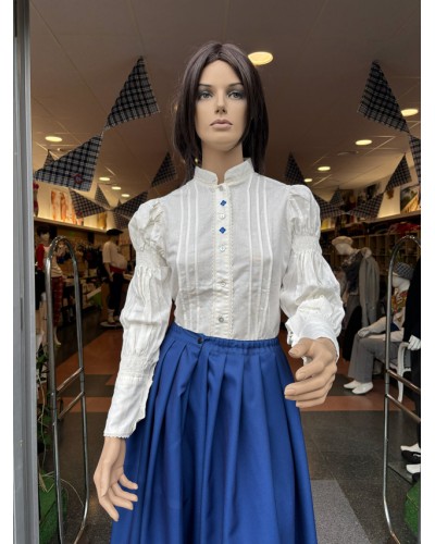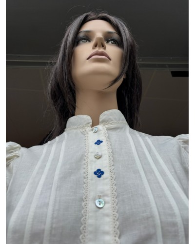 Lihoz egindako blusa zuria, ezin hobea zure euskal janzkera tipikoa laguntzeko. Estilo klasikoa du, mahuka zabalekin eta botoi apainduekin, lauburu urdin itxurako brodatuekin, eta benetako ukitu bereizgarria ematen du. Aukera moldakorra emakumeen euskal jantziaren barruan kalitatezko jantzi tradizionalak bilatzen dituztenentzat.