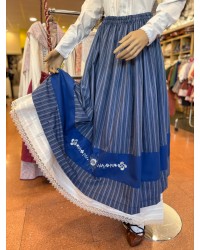 Euskal gona, tonu urdinekoa, ehun zerrendaduna eta behealdean lauburu eta eguzkilorez brodatua. Diseinu orekatu eta soila, tradizioa eta dotorezia gehiegi gabe transmititzen dituena.