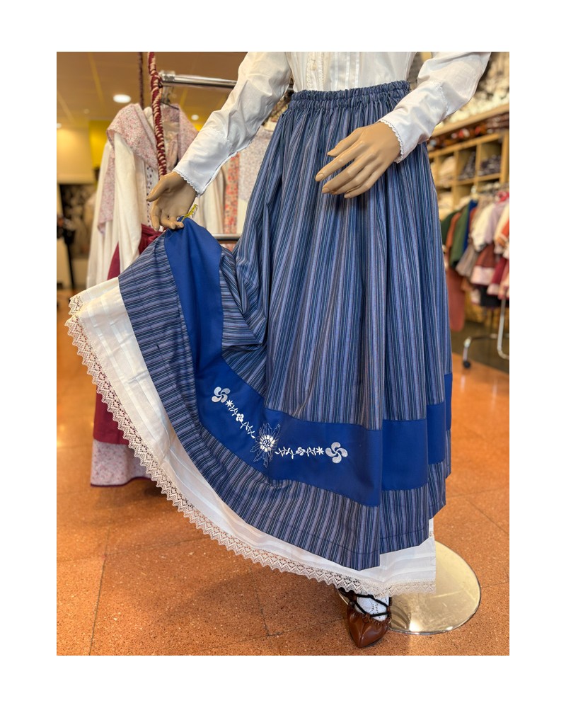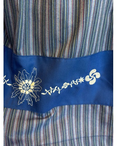 Euskal gona urdina, lauburu eta eguzkilore brodatuarekin