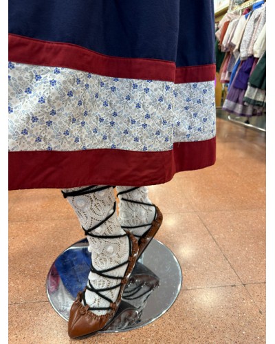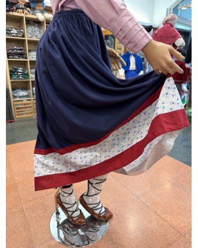 Euskal jantziaren gona tradizionala, itsas kolore urdinekoa, greca gorriz egina eta lore estanpatuko beheko zerrenda. Euskal arropa femeninoaren barruan funtsezko jantzia, euskal jantziak edozein multzotan benetako akabera dotorea emateko aproposa.
