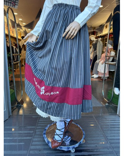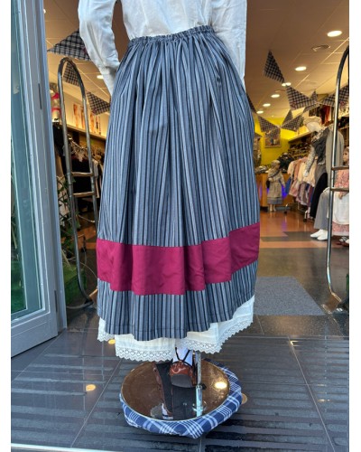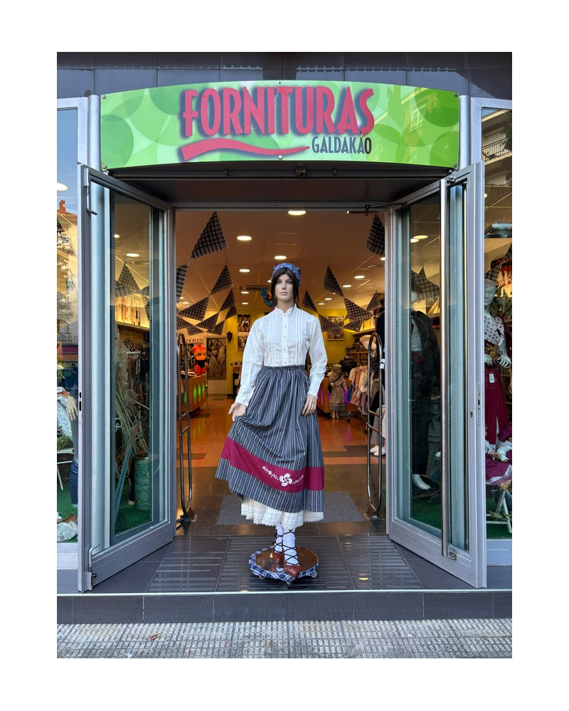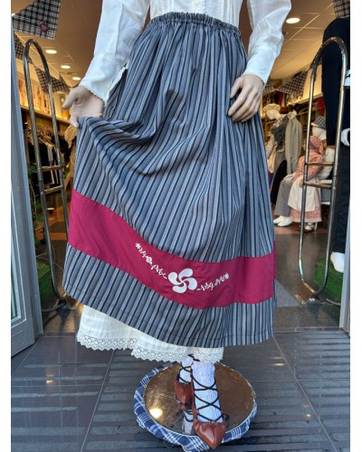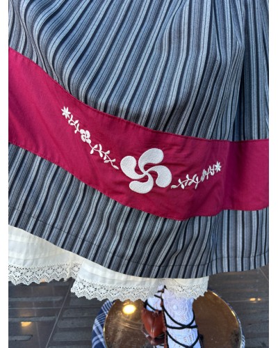 Tonu griseko marradun gona tradizionala, lauburu eta brodatutako lore motiboekin apaindutako zerrenda granatearekin. Ezin hobea euskal eskualdeko jantzia osatzeko.