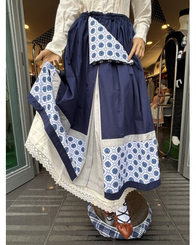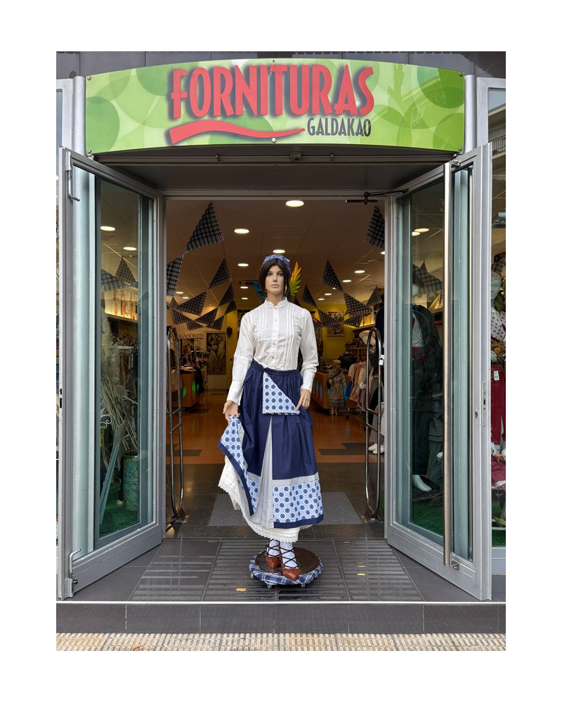 Emakumeentzako euskal jantzia duen gona hau urdin biziz egina dago eta eguzkilore kolore urdin eta zuriko zerrenda estanpatuez apaindua.