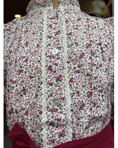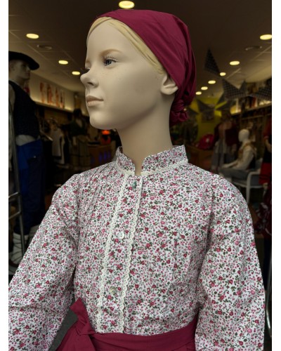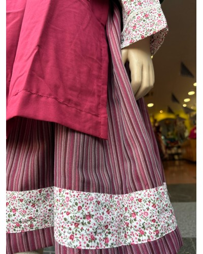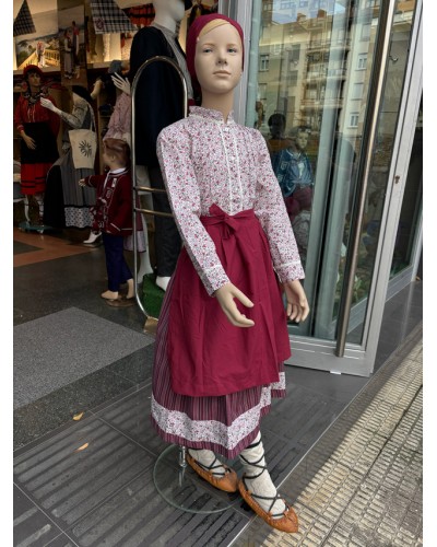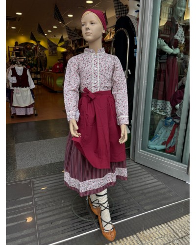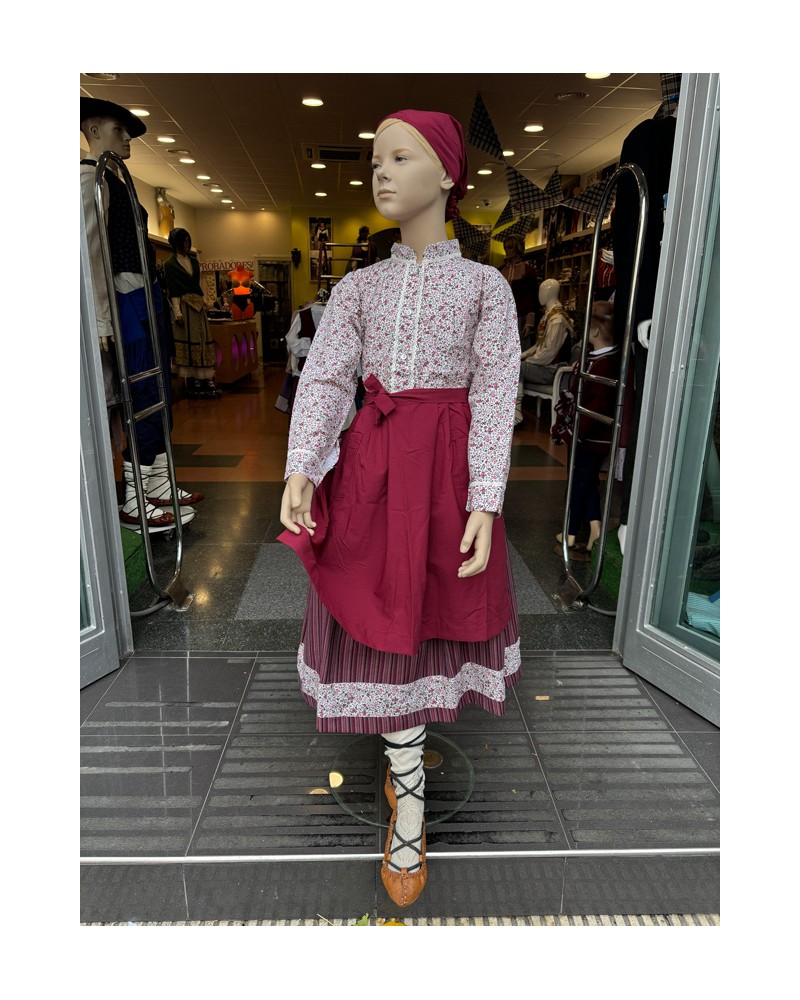 Neskatoentzako multzo tradizionala, granate tonu dotorean. Mahai-zapia, lore-blusa, marradun gona eta mantal konbinatua ditu. Ezin hobea euskal festetarako eta eskolako ekitaldietarako.