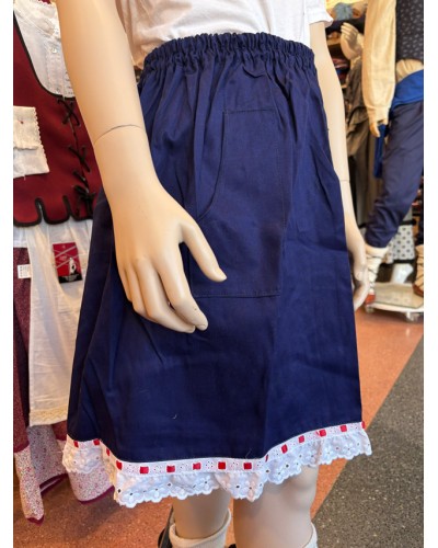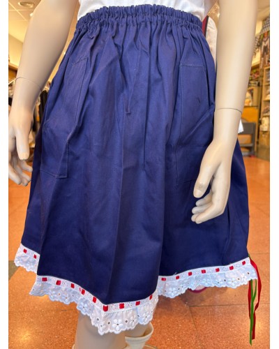 Mahoizko ehun urdinez egindako gona, punta zuria, begizta gorria, begizta berdea eta begizta zuria dituena.
