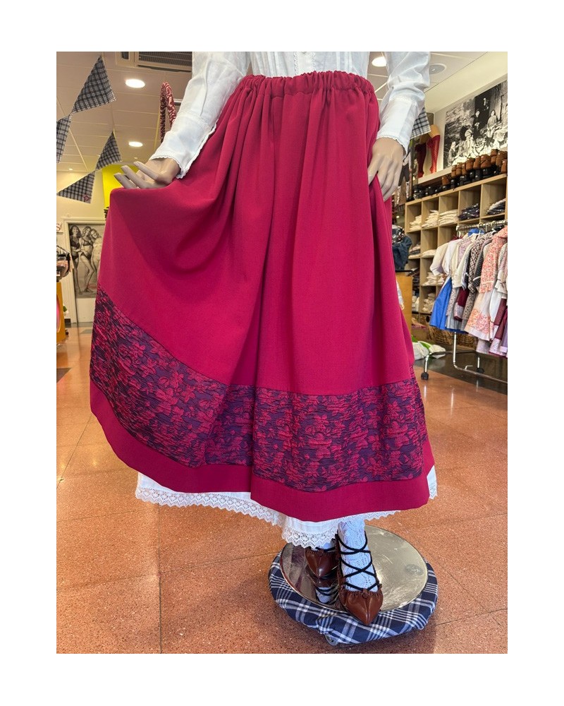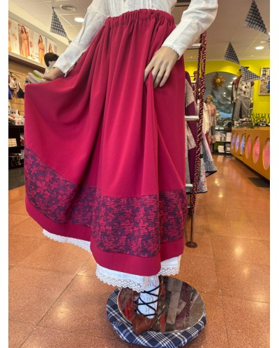 Falda tradicional de mujer en color granate, decorada con una franja bordada floral. Cintura elástica, tejido cómodo y diseño perfecto para trajes regionales y eventos festivos.