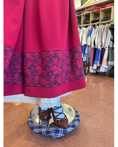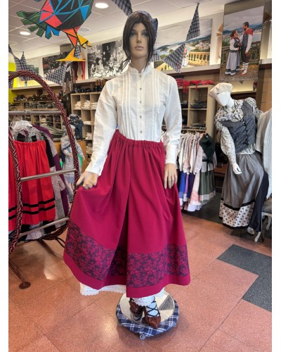 Esta falda de mujer en tono granate destaca por su color intenso y por la franja bordada floral que rodea la parte inferior, aportando un acabado elegante y muy característico del vestuario tradicional. Está diseñada para ofrecer comodidad y amplitud, con una caída fluida que acompaña el movimiento en bailes y celebraciones.
