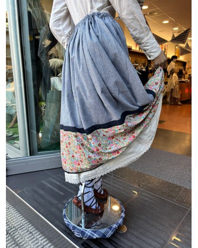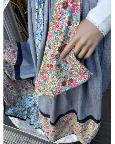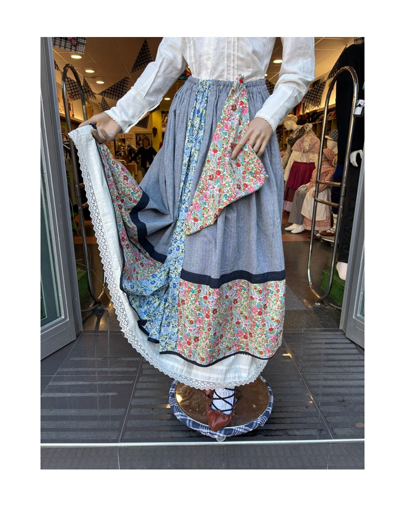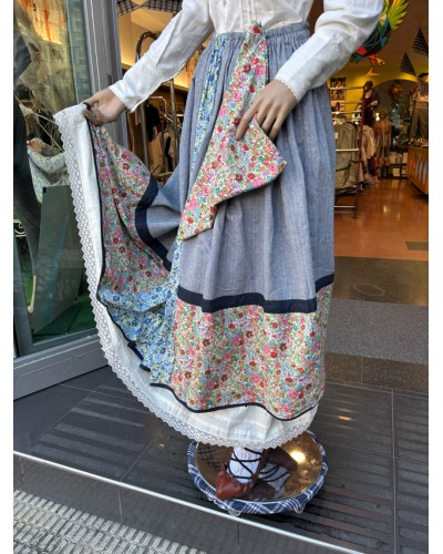 Falda de ropa tradicional vasca en color azul jaspeado con una combinación de motivos florales en la parte inferior, aportando un toque de color sin perder la estética clásica de casera/aldeana. Incluye pañuelo a juego para completar el conjunto.