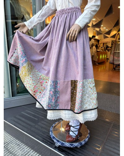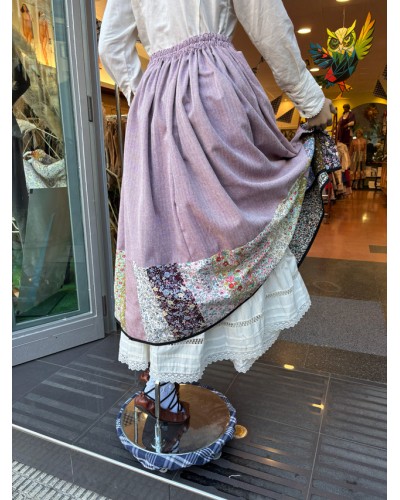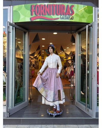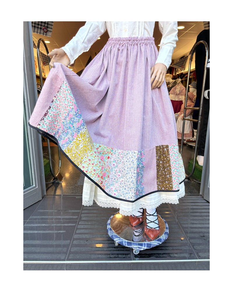 Falda de ropa tradicional vasca para mujer confeccionada en color granate y decorada con patchwork floral en el bajo, aportando un toque artesano muy característico de la indumentaria aldeana. Su tejido es cómodo y ligero, ideal para celebraciones culturales y uso prolongado.