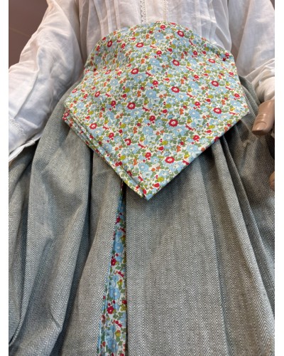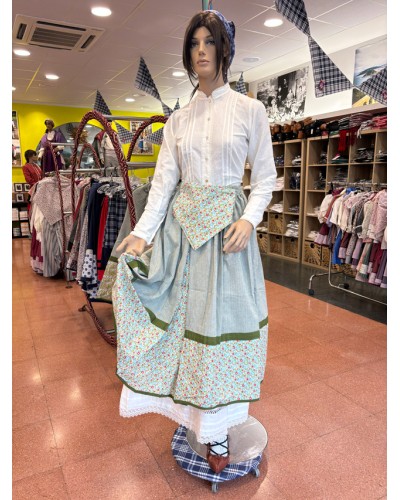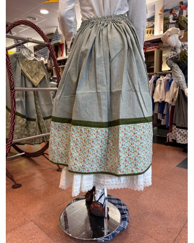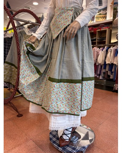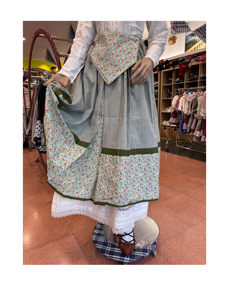 Falda tradicional vasca en tonos verdes con una franja floral en verde claro y detalles en rojo y blanco. Incluye pañuelo a juego. Un modelo ligero, combinable y pensado para trajes de aldeana mujer.