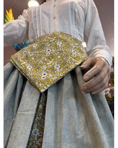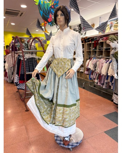 Falda tradicional vasca en tonos verdes con estampado floral blanco y detalle de remate en verde oscuro. Incluye pañuelo a juego para completar el traje de aldeana mujer. Tejido cómodo, caída bonita y diseño muy equilibrado.
