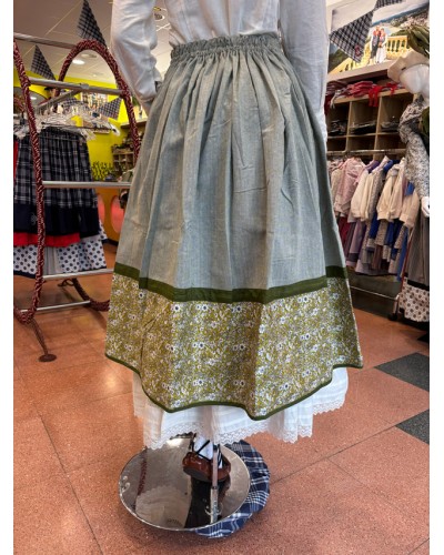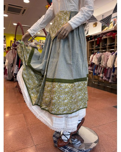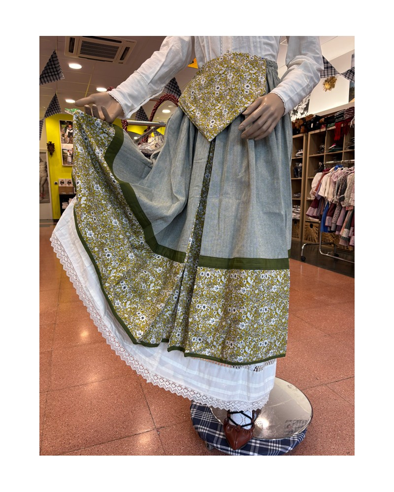 Una falda pensada para quienes quieren un traje vasco elegante y armónico. La parte principal combina un verde grisáceo suave con una franja inferior de motivo floral blanco sobre fondo verde musgo, creando un diseño discreto pero muy vistoso.