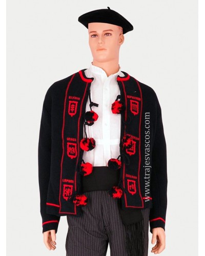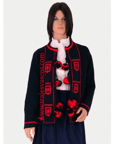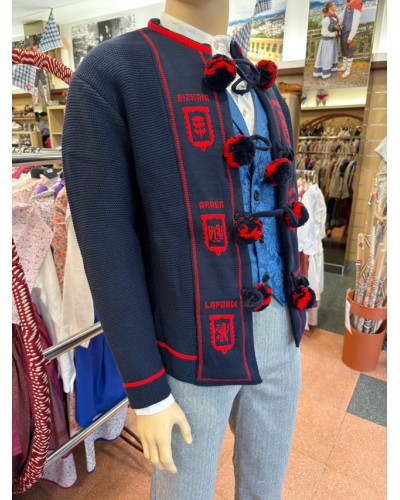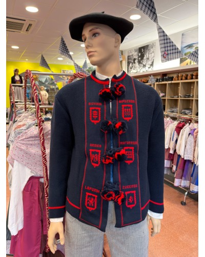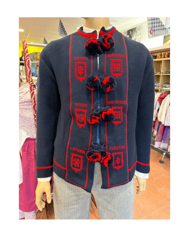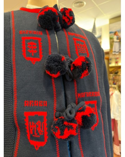 Mendigozal azul marino con pompones rojos y escudos bordados de las siete provincias vascas. Tejido grueso de alta calidad, cómodo y tradicional.