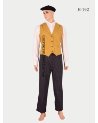 Este traje vasco de hombre destaca por su estilo elegante y llamativo, incorporando un chaleco amarillo de diseño que aporta personalidad y diferenciación dentro de la vestimenta tradicional vasca.