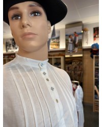 Camisa tradicional blanca para hombre con laburus bordados en color gris. Un diseño elegante y cuidado, ideal para quienes buscan Euskal Jantziak de mayor calidad.