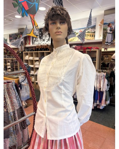 Blusa típica vasca para mujer, diseñada con detalle en la parte frontal gracias a las lorzas verticales que realzan su carácter elegante. Su estilo atemporal convierte esta prenda en un básico dentro de la ropa tradicional vasca, perfecta para lucir en fiestas populares y celebraciones con euskal jantziak.