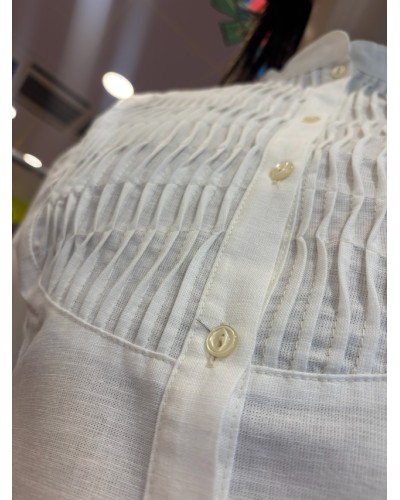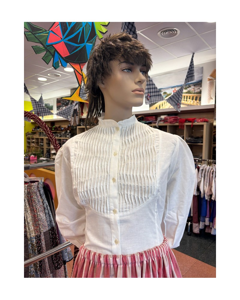 Blusa blanca de corte tradicional, con pechera adornada por delicadas lorzas que aportan un estilo distinguido. Esta prenda forma parte del vestuario clásico de mujer en los trajes vascos y se combina fácilmente con saya o falda. Una opción imprescindible para quienes buscan autenticidad en su traje vasco.