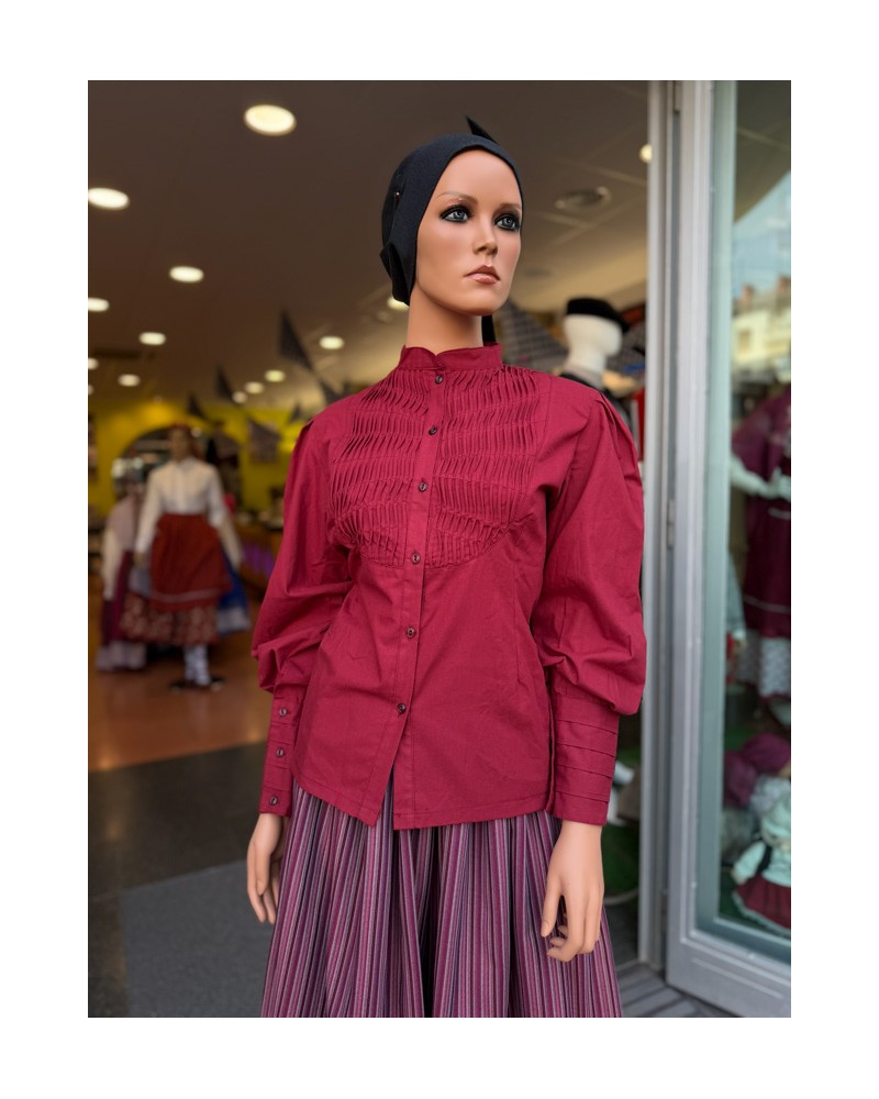 Blusa vasca granate con lorzas decorativas en la pechera y diseño tradicional inspirado en la ropa vasca. Una prenda característica de los euskal jantziak, ideal para combinar con faldas tradicionales y completar trajes vascos en fiestas y celebraciones.
