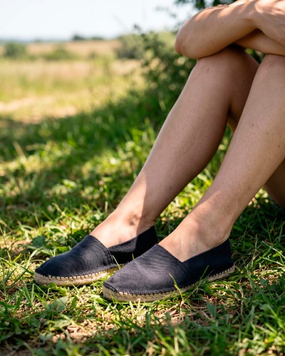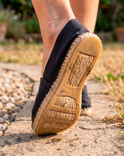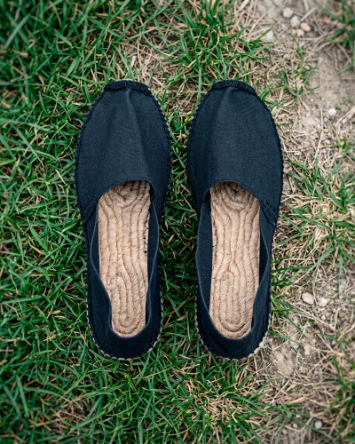 Alpargatas negras de tela con suela de yute natural. Calzado cómodo, ligero y perfecto para completar looks de ropa vasca y estilo tradicional en verano.