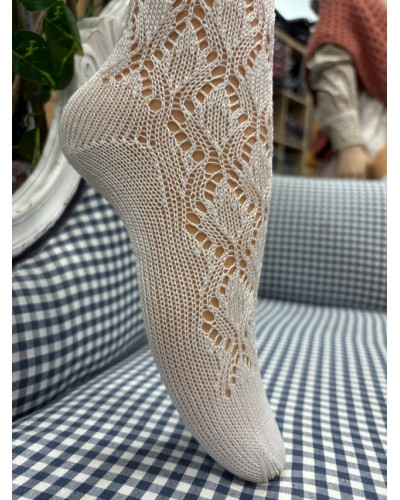 Calcetín de aldeana con calados en forma de hojas, confeccionado en algodón, se puede combinar con cualquier falda vasca.