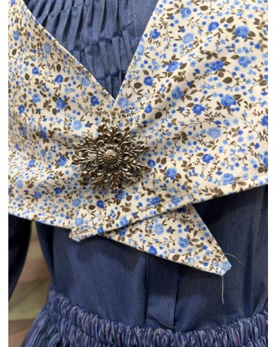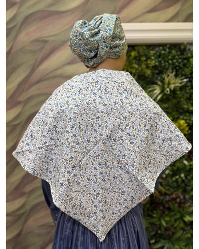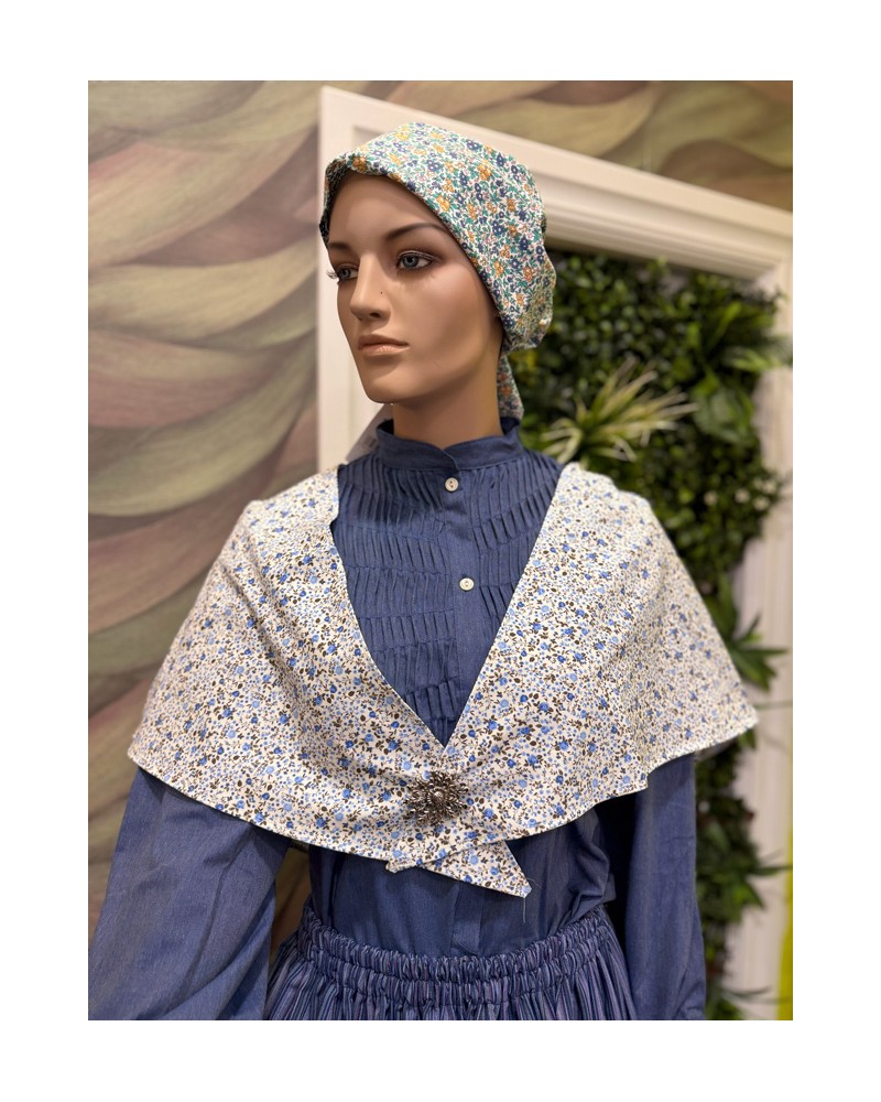 Pañuelo tradicional vasco con estampado floral en tonos azules, ideal para completar trajes vascos de mujer y conjuntos de euskal jantziak. Un complemento clásico que aporta elegancia y autenticidad a la vestimenta tradicional de Euskal Herria.