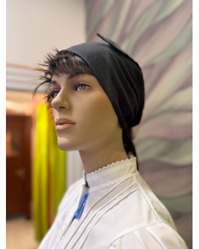 Pañuelo vasco negro para la cabeza ya confeccionado y listo para colocar fácilmente. Un complemento tradicional muy utilizado en trajes vascos femeninos y conjuntos de euskal jantziak.