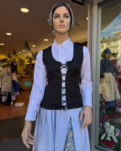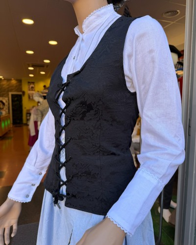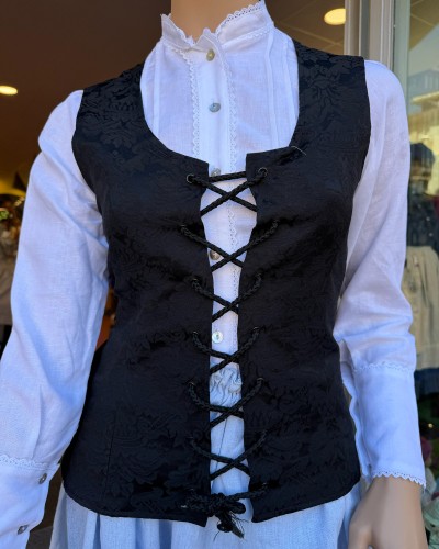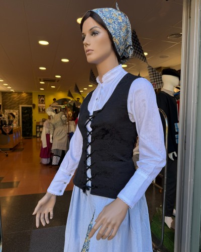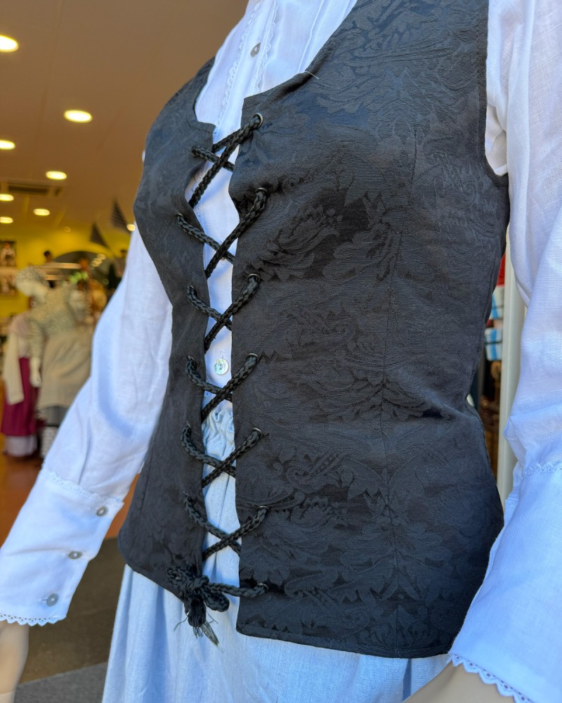 Corpiño negro de estilo vasco con tejido adamascado y cierre de cordones. Una prenda versátil y elegante, imprescindible en cualquier conjunto de trajes vascos o ropa tradicional vasca.