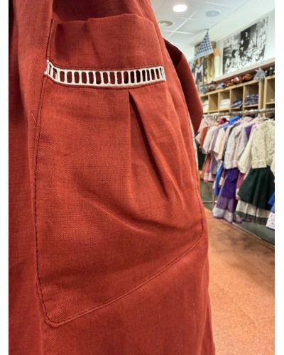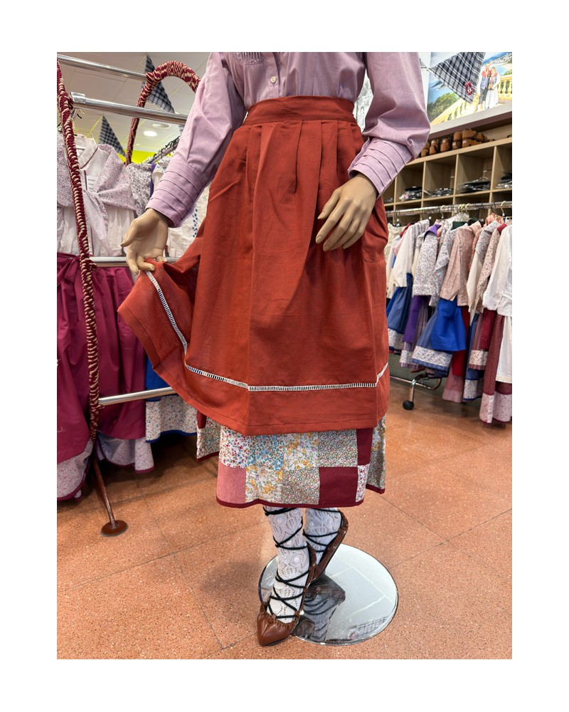 Delantal de lino color teja para traje tradicional vasco, una prenda esencial dentro de la ropa vasca femenina que aporta autenticidad, elegancia y armonía al conjunto de Euskal Jantziak.