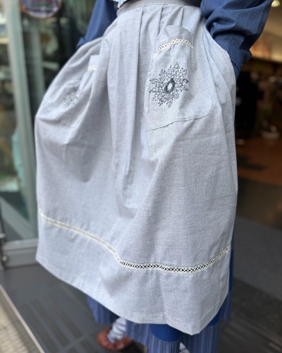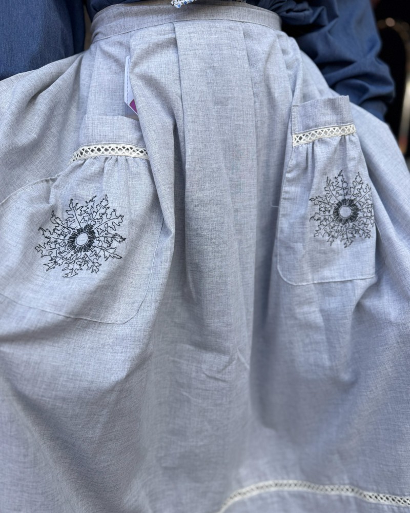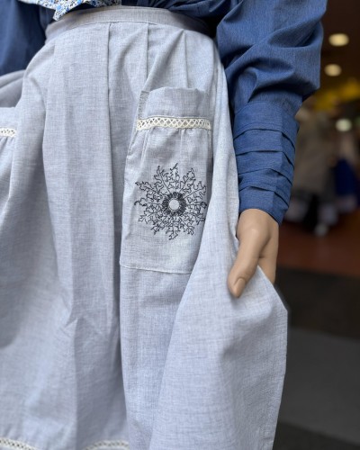 Delantal vasco en tono azul claro con eguzkilore bordado en los bolsillos, una prenda de estilo tradicional que aporta luz y personalidad al conjunto de ropa vasca.