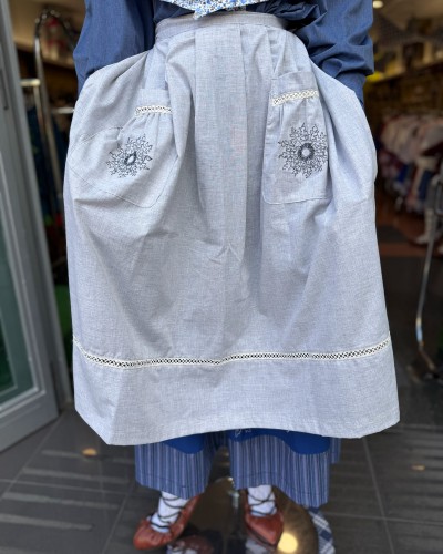 Este delantal vasco en tono azul claro es una opción diferente dentro de los trajes tradicionales vascos o euskal jantziak, ideal para quienes buscan un conjunto más luminoso sin perder la esencia tradicional. Su color suave permite crear combinaciones muy equilibradas con blusas, faldas y corpiños.