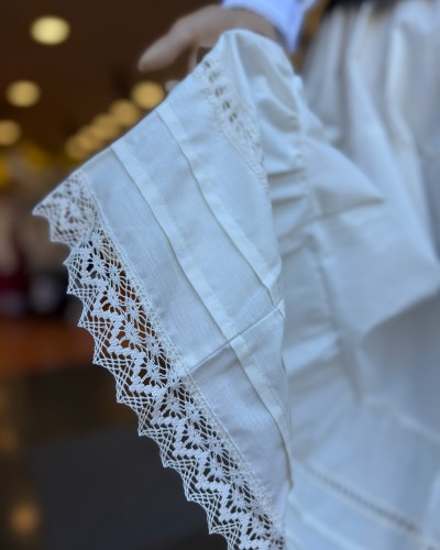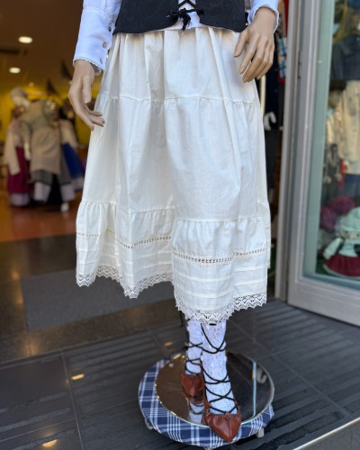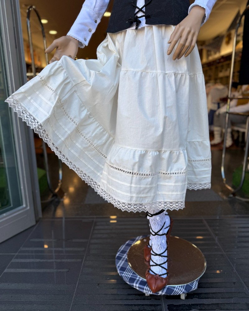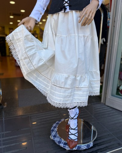 Enagua vasca blanca en tono natural ligeramente roto, confeccionada con puntilla bordada y pensada para completar trajes vascos con un acabado elegante y auténtico.