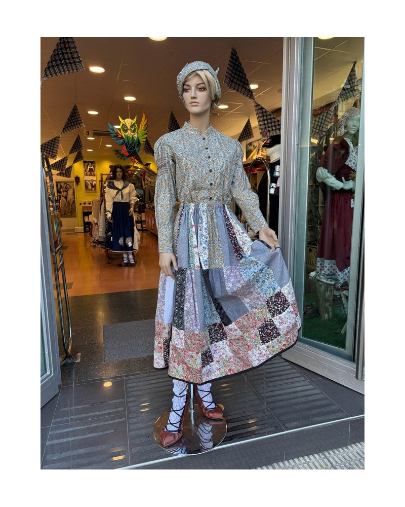 La falda patchwork tradicional es una prenda característica del traje vasco de mujer, elaborada con retales de diferentes tejidos y colores que crean un diseño único y lleno de personalidad. Este estilo refleja la esencia de la indumentaria popular, donde cada falda resulta especial gracias a la combinación de estampados florales y geométricos.