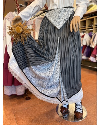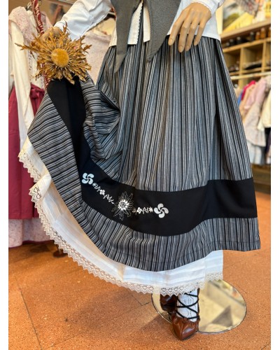 Nuevo Falda vasca en tonos negros... Precio 99,75 € Falda vasca tradicional en tonos negros y grises, elaborada en tejido listado y rematada con un discreto bordado de lauburu y eguzkilore en el...