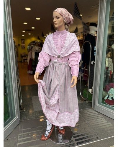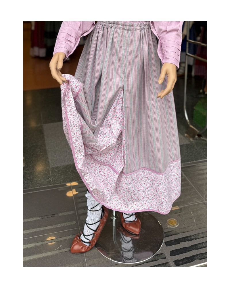 Falda tradicional para traje vasco en tonos rosa y gris con raya vertical y bajo floral combinado. Prenda clave dentro de la ropa vasca tradicional y euskal jantziak. Pañuelo de los hombros incluido con la falda.