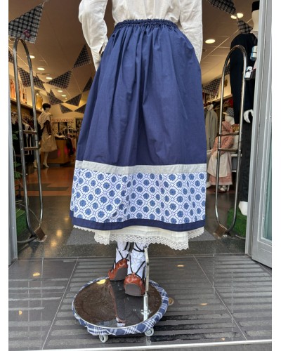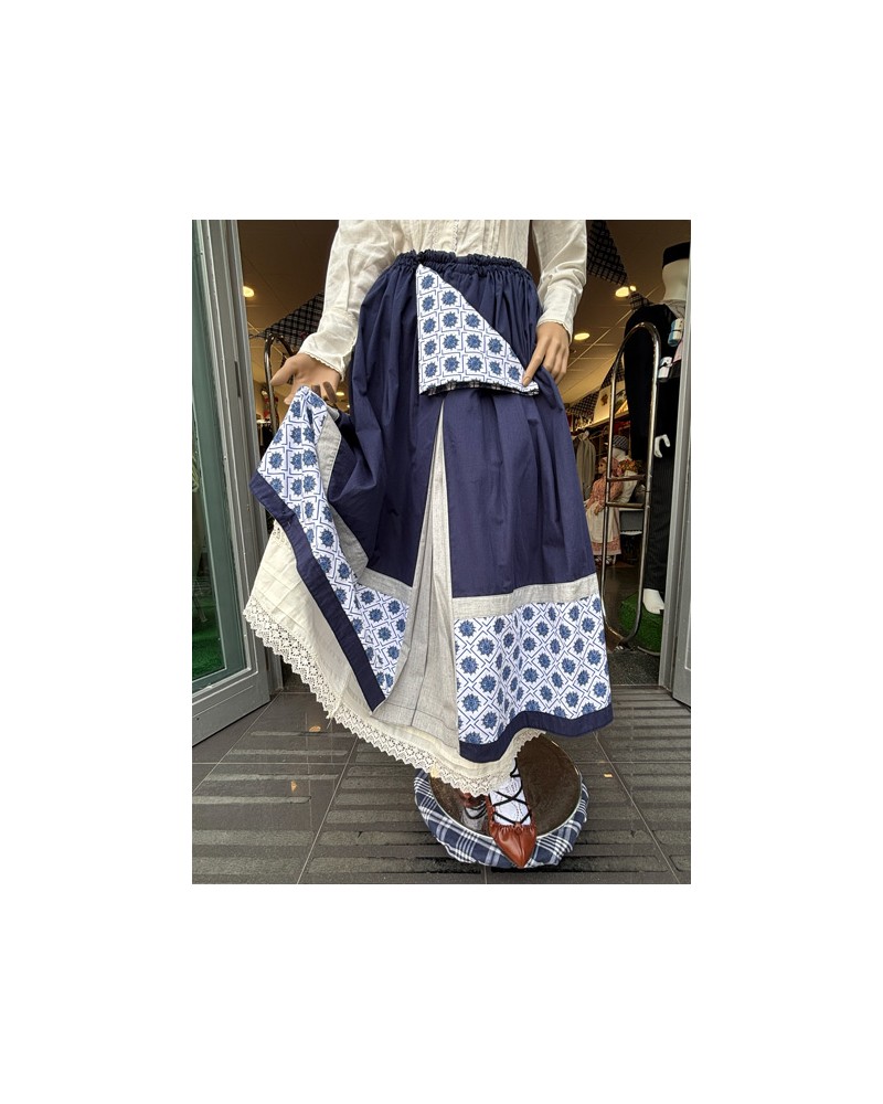 Esta falda de traje vasco para mujer está confeccionada en azul intenso y adornada con cenefas estampadas de eguzkilore en tonos azules y blancos, lo que la convierte en una prenda única y cargada de significado.