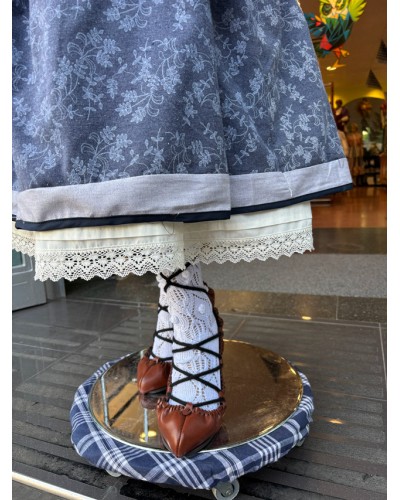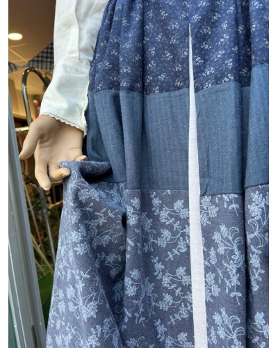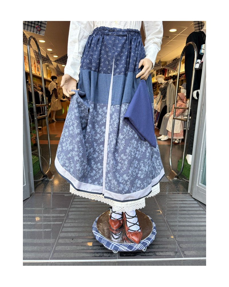 - Falda de varios paños azules, con detalles florales y cenefas en diferentes tonos.