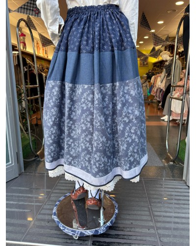 Esta falda de traje vasco para mujer destaca por su juego de contrastes en tonos azules, combinando distintos estampados tradicionales que le aportan carácter y autenticidad.