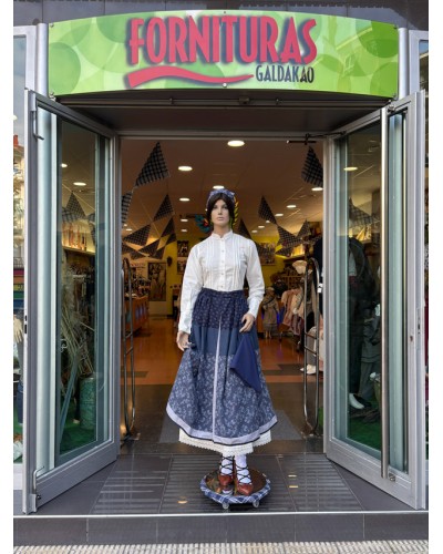 Falda de traje regional vasco para mujer en tonos azules, con estampados combinados y pañuelo incluido. Un diseño auténtico para completar tu indumentaria vasca.