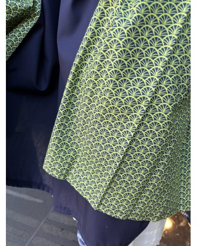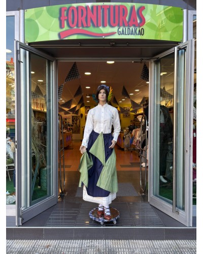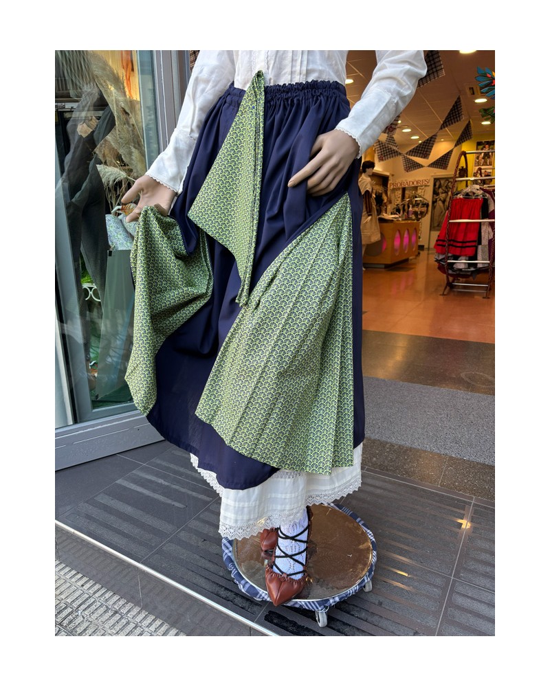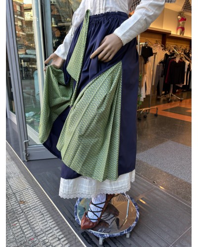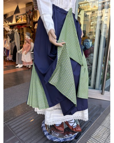La combinación de colores vivos y sobrios es parte de la riqueza de la indumentaria tradicional vasca. Esta falda para mujer reúne la elegancia del azul marino con la frescura del verde, creando un contraste muy característico en los trajes regionales.