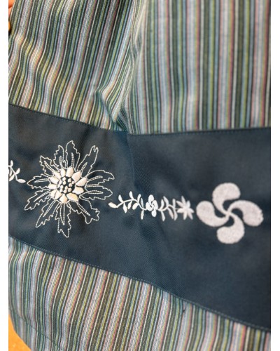 Esta falda vasca verde destaca por su tejido listado de inspiración tradicional y por el cuidado bordado inferior con lauburu y eguzkilore, dos símbolos profundamente ligados a la cultura vasca. Su diseño aporta movimiento, armonía y un acabado muy elegante, manteniendo la esencia de los trajes regionales de siempre.